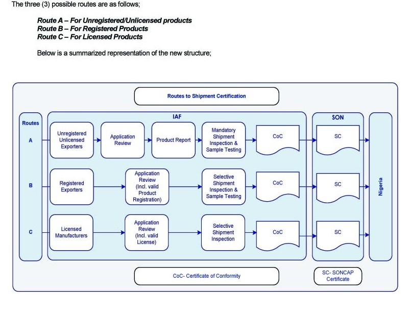 尼日利亚国家标准局(StandardOrganizationofNigeria,SON)是尼日利亚负责制定和执行进口商品和本国制造产品质量标准的政府机构。为确保管制产品符合已获准施行的该国技术标准或其他国际标准,保护尼日利亚消费者免受不安全产品或不符合标准的产品的损害,尼日利亚国家标准局决定对出口到该国的管制产品实施装船前强制性合格评定程序(以下简称SONCAP)。